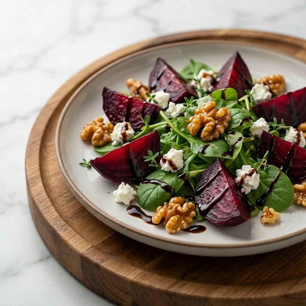 Roasted beetroot, baby greens, goat cheese, candied walnuts, balsamic glaze.